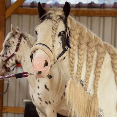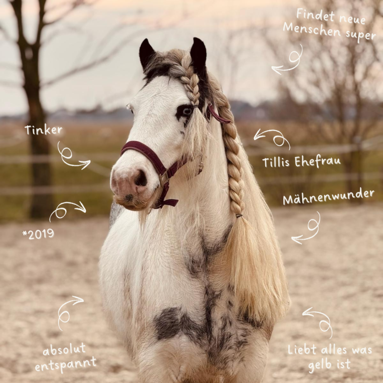 Tipsy ist eine Tinkerstute mit einer beeindruckend langen, dichten Mähne – sie ist nicht nur ein echter Hingucker, sondern auch eine kleine Persönlichkeit. Mit ihren sechs Jahren bringt sie jede Menge Neugier und Spielfreude mit, manchmal auch ein bisschen Schalk im Nacken.