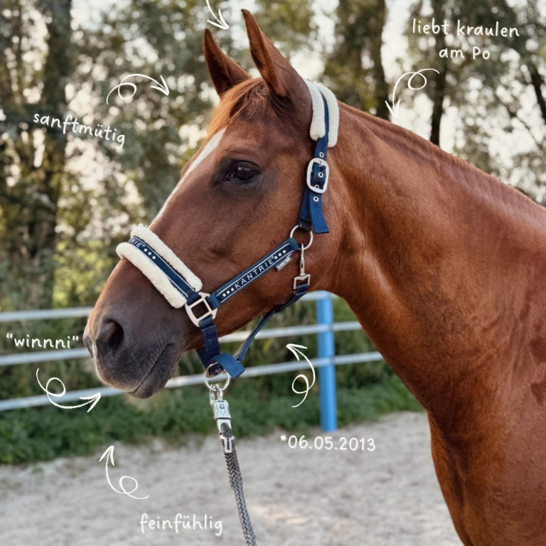 Winja ist eine große Fuchsstute mit sanftem Blick und einer Ausstrahlung, die sofort Ruhe schenkt. Ob Bodenarbeit, Reiten oder einfach nur Schmusen – Winja ist für alles zu haben. Sie begegnet jedem Menschen mit Offenheit, Geduld und einem feinen Gespür für Stimmung und Nähe.